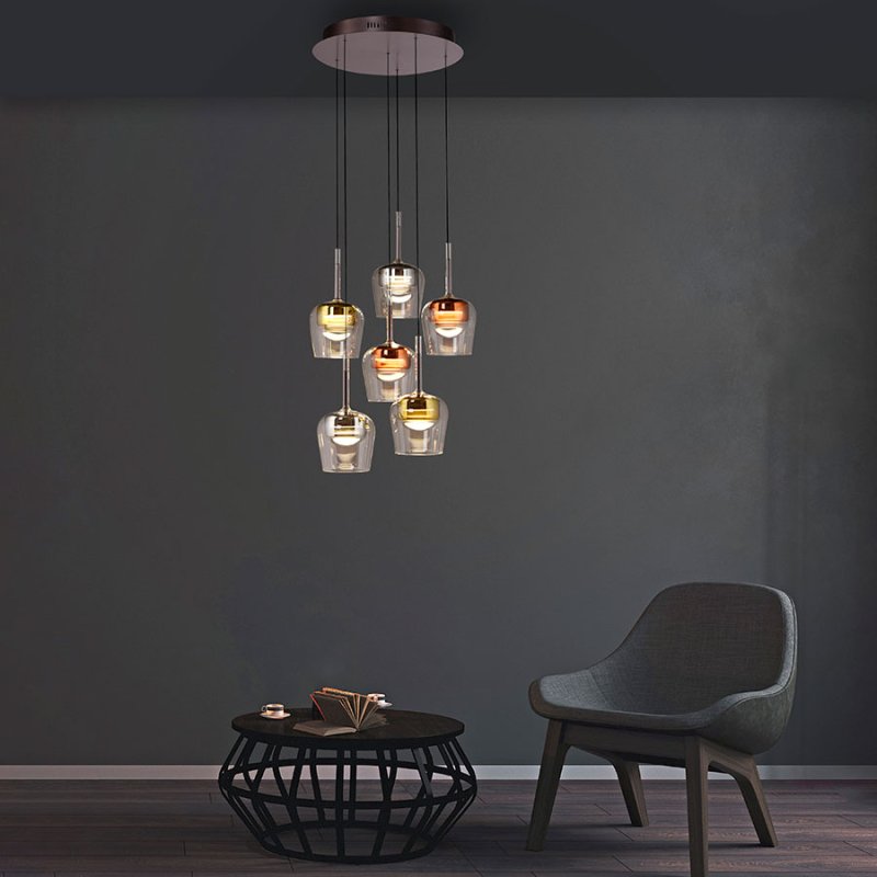 LED Полилей Q-KON е иновативно осветително тяло, което съчетава модерен дизайн и интелигентни технологии. С метална основа в кафяв цвят и шест разсейватели от прозрачно стъкло, които обхващат изкусно проектирани вътрешни стъкла в цвят сребро, злато и мед, този полилей излъчва изисканост и стил. Със своята кръгла форма, той е перфектно допълнение към съвременния интериор и е идеален избор за осветление във всекидневна, кухня или спалня.
