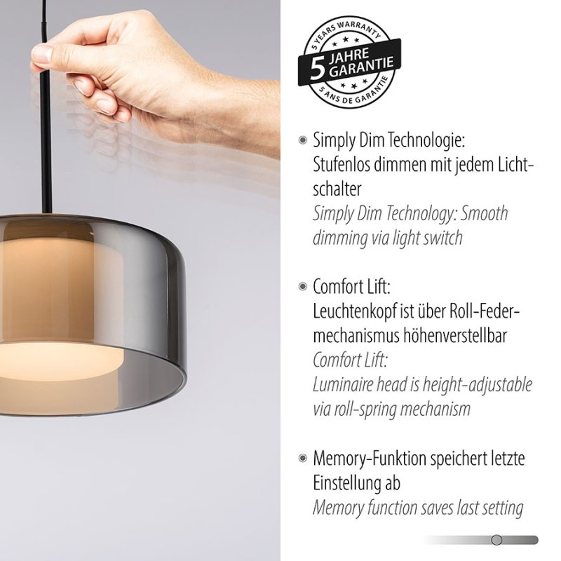 Полилеят е снабден с функции за димиране (Simply Dim), които позволяват плавно регулиране на интензитета на светлината, както и с функция Memory, която запазва последно избраните настройки дори след изключване от мрежата. Допълнително, иновативната функция Comfort-Lift осигурява лесно регулиране на височината, което прави осветителното тяло изключително удобно за употреба.