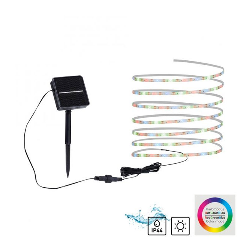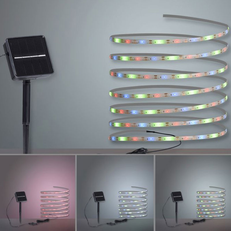 Соларната лента е с вградена батерия 1200mAh, която се зарежда от слънчевата енергия през деня и автоматично осветява градината след здрач; 8 различни цветови режима с RGB функция за смяна на цветовете - червен, зелен, син и техните комбинации; автоматичен цветен преход, който създава динамични светлинни ефекти; превключвател за включване и изключване; IP44 защита (защитен от твърди предмети до 1 мм и от пръскане от всички посоки), което я прави подходяща за външна употреба.