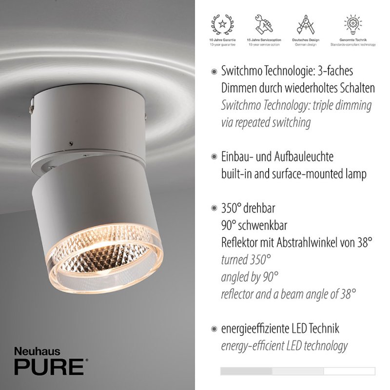 Спот лампата е снабдена с възможност за димиране, осигурявайки плавен контрол на яркостта чрез функцията Switchmo. Със своята адаптивност, тя може да се върти до 350° и да се накланя на 90°, което позволява насочване на светлината точно там, където е необходимо. Освен това, осветителното тяло може да се монтира както върху, така и под мазилка, което дава допълнителна гъвкавост при инсталация.