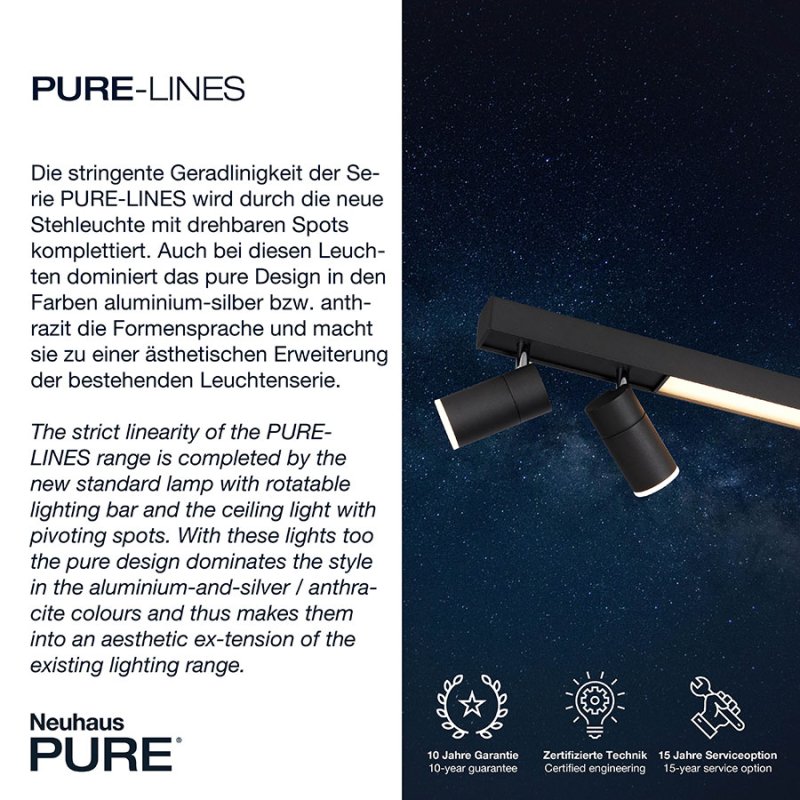 LED Спот лампа PURE Lines Spot е модерно осветително тяло, което съчетава елегантен дизайн и изключителна функционалност. С алуминиева основа в цвят антрацит , линейна форма и въртящи се спотове, този плафон е идеален избор за осветление във всекидневна, кухня, коридор или офис.