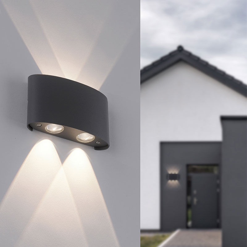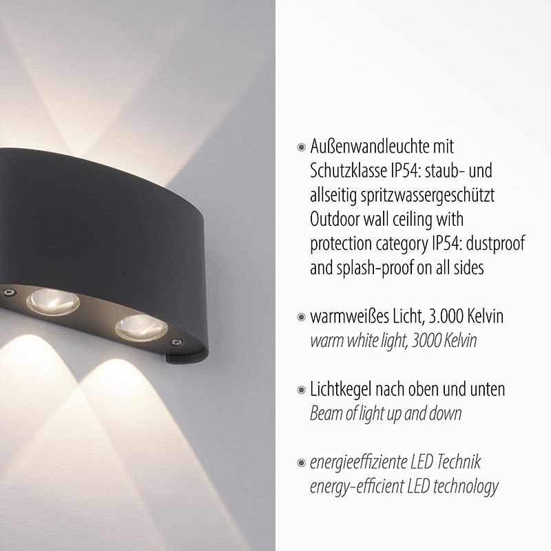 Осветително тяло - модерно LED фасадно осветление, аплик за градина CARLO. Изработен от метал в черен цвят и разсейвател от пластмаса. Апликът свети нагоре и надолу. Осветителното тяло е е със защита IP54 - срещу пръскане от всички посоки, защита от контакт с твърди частици и ограничена защита от прахoви частици. Производител Paul Neuhaus, Германия.