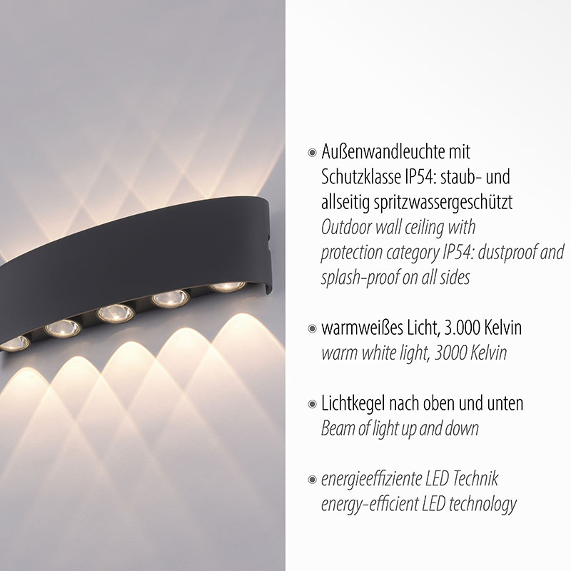 Осветително тяло - модерно LED фасадно осветление, аплик за градина CARLO. Изработен от метал в черен цвят и разсейвател от пластмаса. Апликът свети нагоре и надолу. Осветителното тяло е е със защита IP54 - срещу пръскане от всички посоки, защита от контакт с твърди частици и ограничена защита от прахoви частици. Производител Paul Neuhaus, Германия.