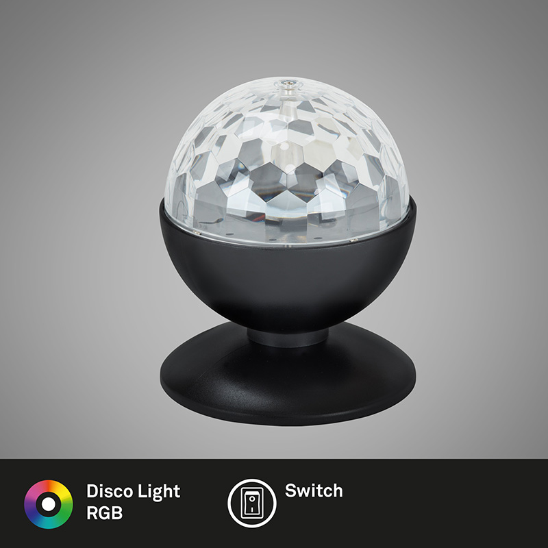 LED-RGB настолна лампа DISCO LIGHT, изработена от пластмаса в черен цвят. Лампата променя цвета на светлината при завъртане. Кабелът е с ключе за удобно включване и изключване. Производител BRILO, Германия.