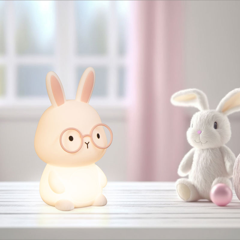 RGB детска силиконова нощна лампа Josie, изработена от мек силикон в розов цвят с очарователен дизайн на зайче с розови ушички и сладки розови очилца. Осветителното тяло е с RGB функция, която позволява избор между 7 различни цвята светлина, създавайки приятна и уютна атмосфера в детската стая според настроението и предпочитанията.