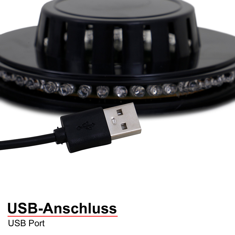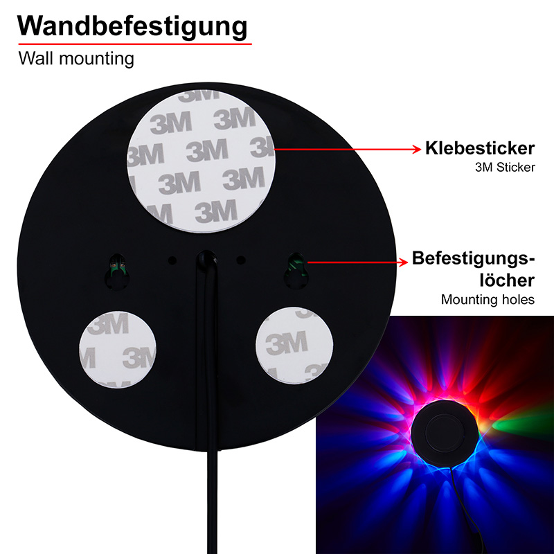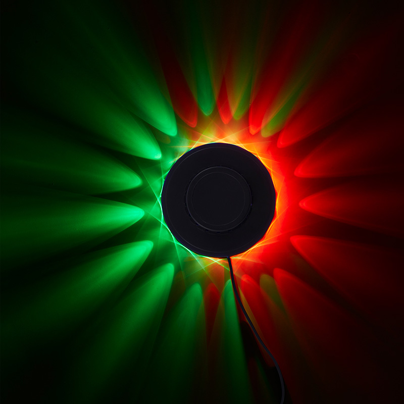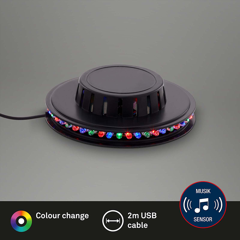 Ефектно RGB колело с музикален сензор. Колелото е изработено от пластмаса с вградени лед диоди. Лампата е с вграден музикален сензор, чрез който цветовете могат да се сменят в ритъм с музиката. 2 метра USB кабел, включен в комплекта. Дизайнът на осветителното тяло е подходящ за осветление за всекидневна, осветление за спалня, осветление за детска стая. Производител BRILO, Германия.