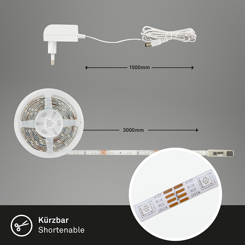 Осветително тяло - RGB-LED лента SUPERLINE, самозалепваща със силиконово покритие. Лед лентата може да се контролира чрез включеното в комплекта дистанционно. Лентата може да бъде отрязана на всеки 10 см. С включен драйвър 1A. Имате възможност да избирате между различни цветове, програми и ефекти на светене. Производител BRILO, Германия.