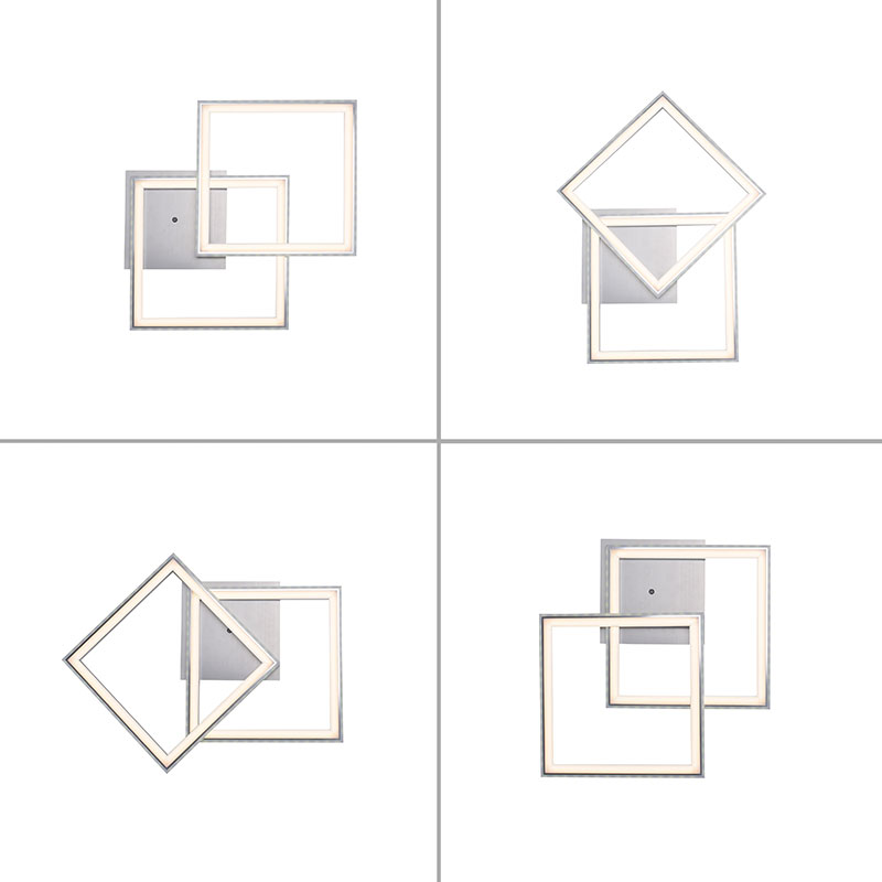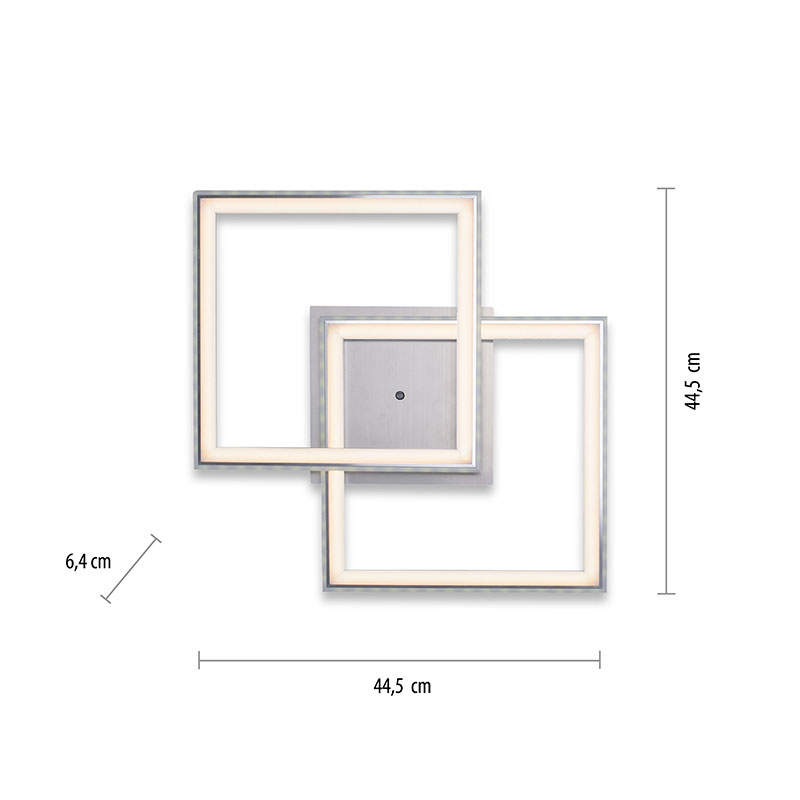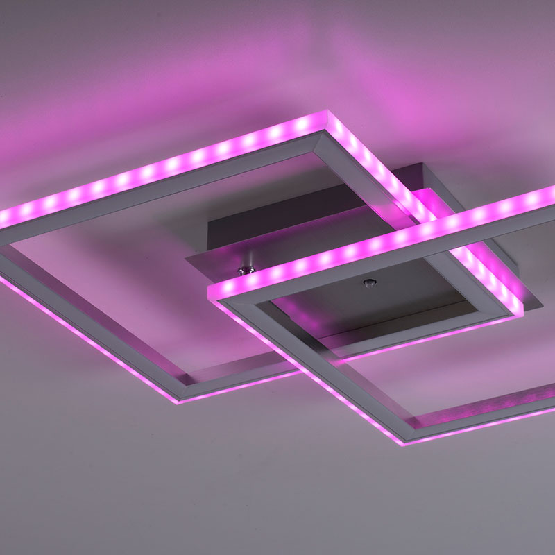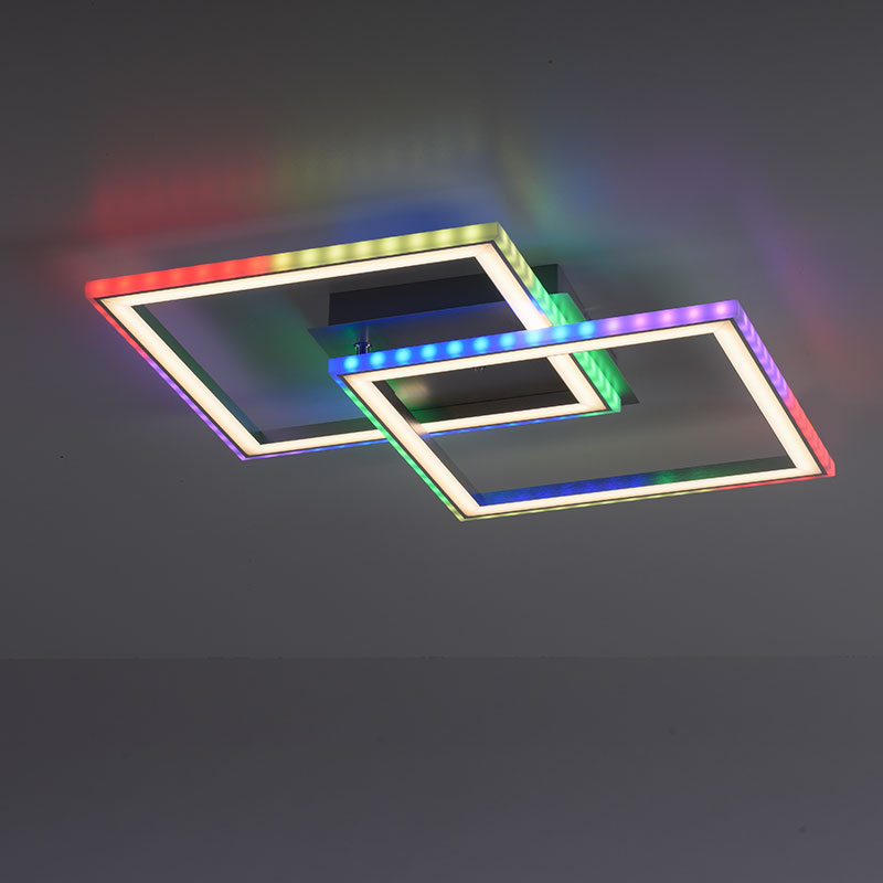 Осветителното тяло е с модерен дизайн от два припокриващи се правоъгълника и е подходящо за осветление за хол, спалня, трапезария, кухня или коридор. Комбинацията от функционално основно осветление и декоративна RGB подсветка позволява да променяте атмосферата в помещението според настроението и повода - от концентрирана работна светлина до релаксираща цветна атмосфера за специални вечери или партита.