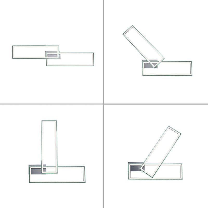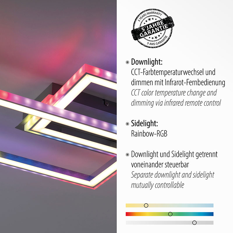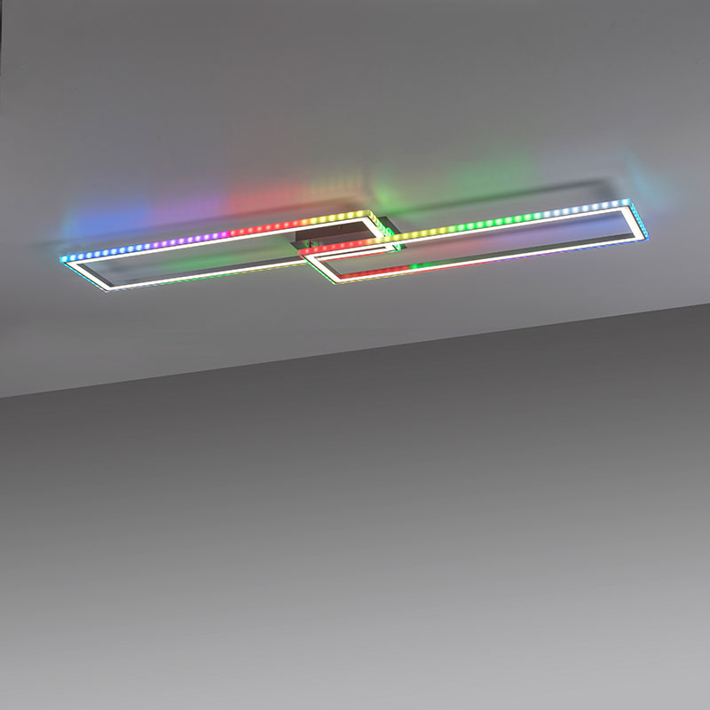 Осветителното тяло е с модерен дизайн от два припокриващи се правоъгълника и е подходящо за осветление за хол, спалня, трапезария, кухня или коридор. Комбинацията от функционално основно осветление и декоративна RGB подсветка позволява да променяте атмосферата в помещението според настроението и повода - от концентрирана работна светлина до релаксираща цветна атмосфера за специални вечери или партита.